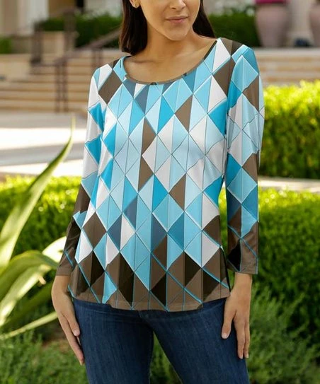 Printed top designed with three-quarter sleeves and a scoop neck.