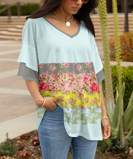 Layered ruffle sleeves perk up the potential of this v-neck tunic, and a bold print sets you apart from the pack wherever you go.