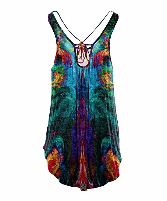 Replenish your casual collection with the billowy cut of this sleeveless tunic fashioned with an array of bright hues and a vivid print. A back-tie accent ensures a comfy fit.