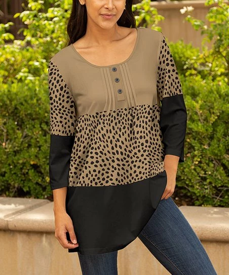 Ease through the day in this long-sleeve tunic featuring a buttoned neckline accented by pleated details.