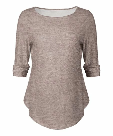 Create casual ensembles in this curved-hem top boasting three quarter-length sleeves and stretch-infused fabric for comfortable season-spanning style.