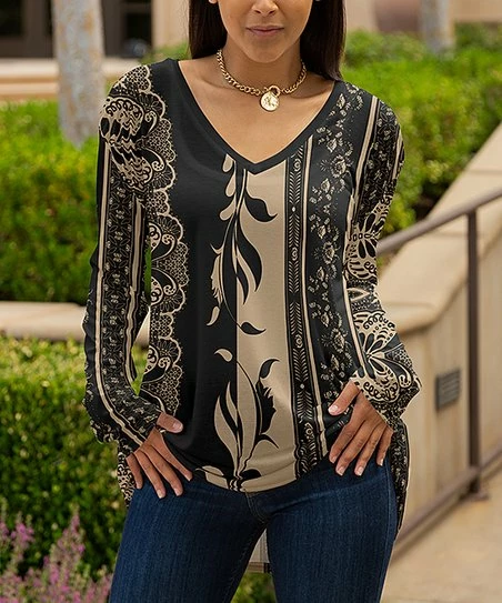 Add intrigue to your everyday look with this soft and comfortable tunic featuring an artful allover pattern and wide, feminine v-neckline.