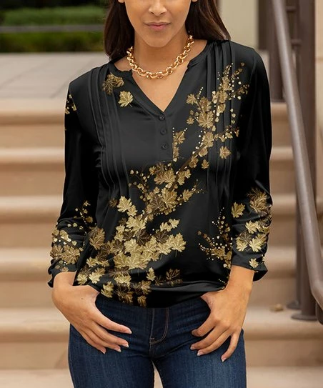 Enliven your wardrobe with this tunic that features a blooming print and a pleated button-up notch neckline.