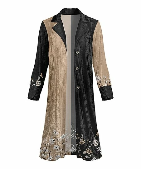 Lend a luxurious touch to your outfit with this soft velvet duster boasting a bold pattern. Buttons along the front let you secure it for extra warmth when temperatures dip.