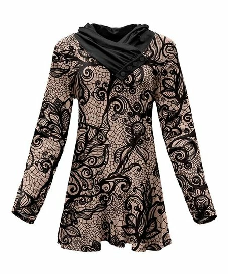 Designed with a can’t-miss print and button-embellished cowl neckline, this stretchy knit tunic keeps you comfortable in statement-making style.