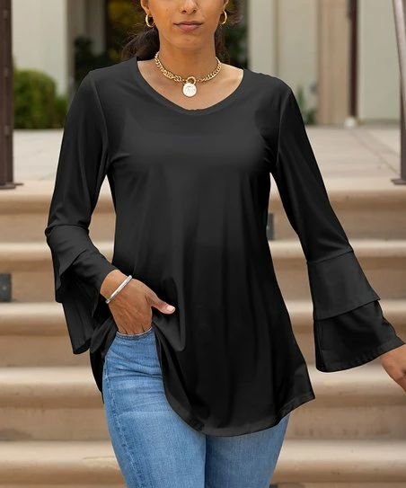 Make a statement at any get-together with this classic tunic featuring a solid, neutral hue and crafted with a hint of stretch for all-day comfort.