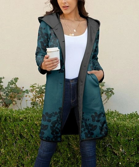 Lily | Black & Blue Floral Fleece Pocket Hooded Coat – Women