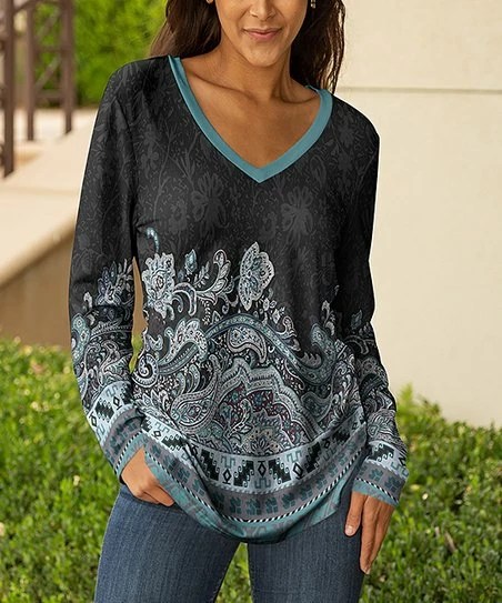 Laid-back tunic featuring long sleeves for full coverage and a v-neckline.