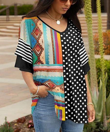 Make your warm weather ensemble pop with pizzazz, free-spirited flair by donning this ruffle-layer tunic sporting a polished v-neck and mix of prints.