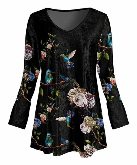 A great way to add more interest to your casual look is by wearing a top with an enhanced print and soft texture. This long-sleeve v-neck features stretchy velvet fabric and an eye-catching design.