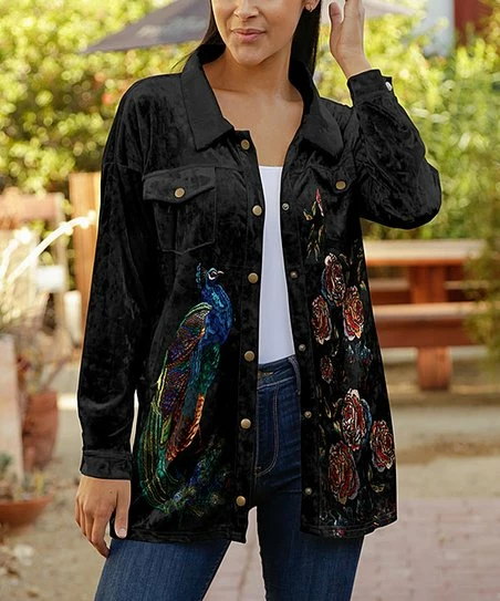 Snap button-up shacket featuring a velvety texture with floral and peacock print. Snap-button flap pockets.