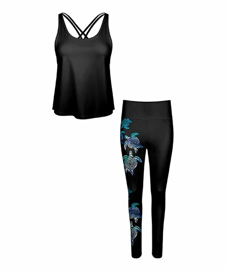 - Includes a black racerback tank and black and blue sea turtle leggings (two pieces total)