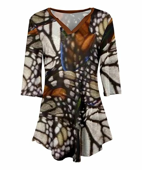 Add to your wardrobe with this colorful three-quarter sleeve tunic that features a flattering v-neckline and a comfortable relaxed fit.