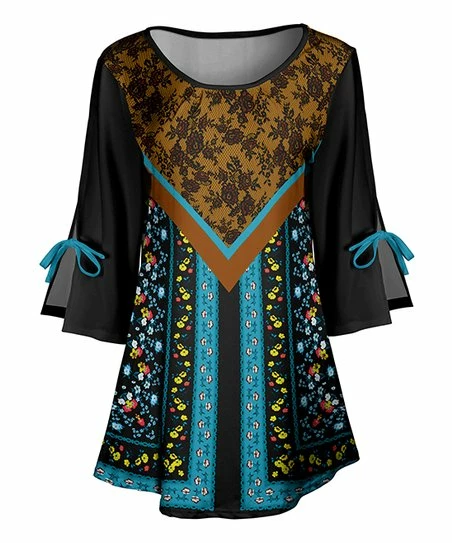 Bows accent the side slits along the three-quarter sleeves of this flowy stretch-enhanced tunic for a playful touch.