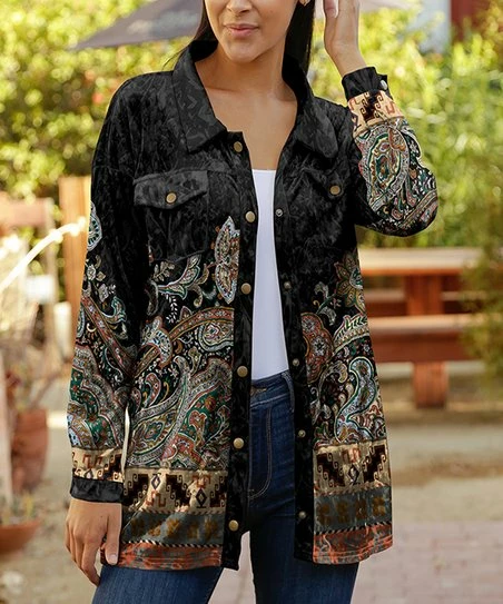 Throw this button-snap shacket on when the cooler weather sets in. Velvety material and chest pockets.