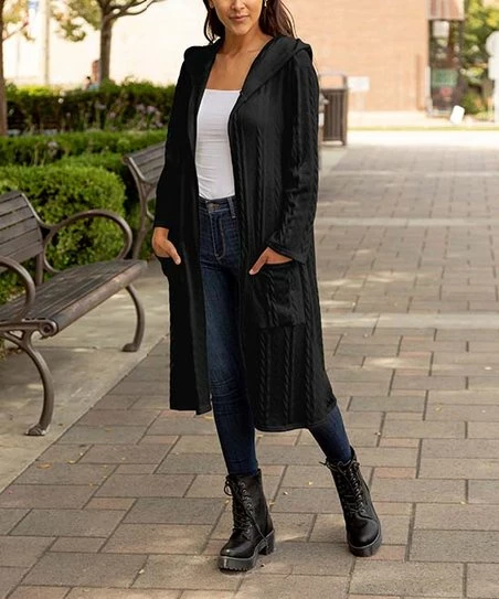 Fend off cooler temperatures in this cozy cable-knit hooded duster featuring pockets to warm your hands or carry little necessities.