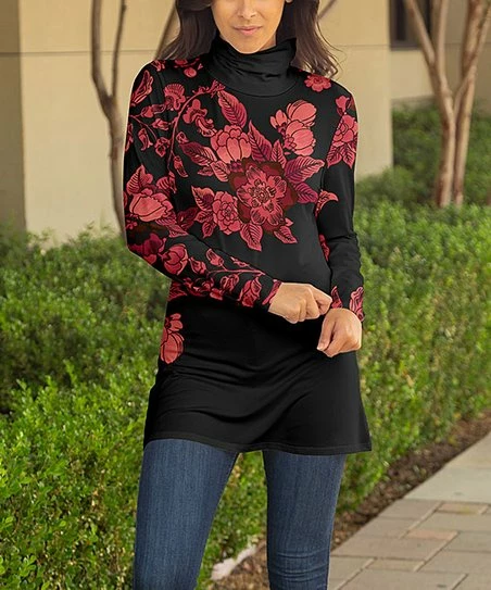 Flaunt chic style in this tunic that features a colorful floral motif and a turtleneck design. Its stretch-enhanced blend promises flexible comfort all day long.