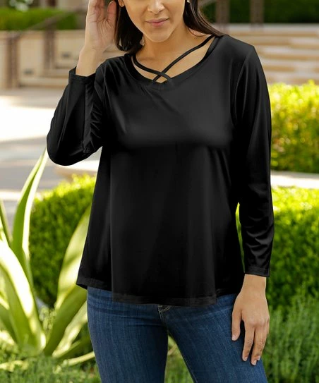 Elevate your ensemble with this stretch-infused top featuring a crisscross detail along the neckline.
