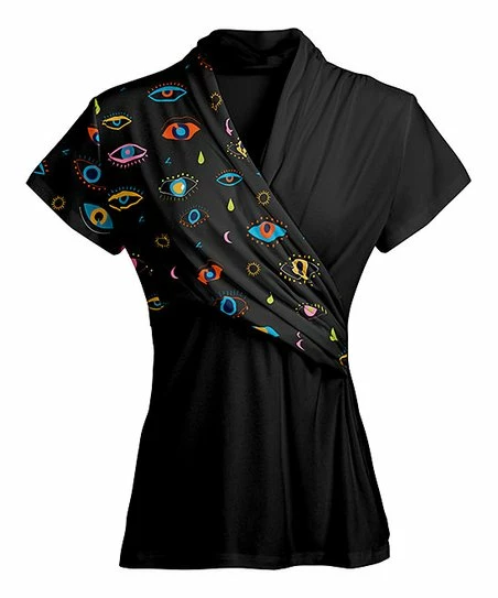 A surplice neckline highlights your features and emphasizes your waist in this short-sleeved tunic accented with a pop of print.