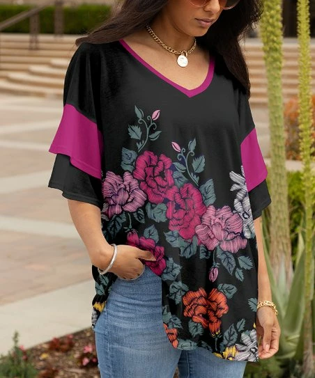 Lend a lively dash of panache to your everyday ensemble with this whimsically patterned tunic featuring tiered ruffles dancing along the short sleeves. The relaxed fit and stretch-infused material make it a comfy choice.