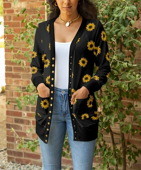 This cardigan banishes chilly days by wrapping you in comfort with a hint of stretch and a bold print.
