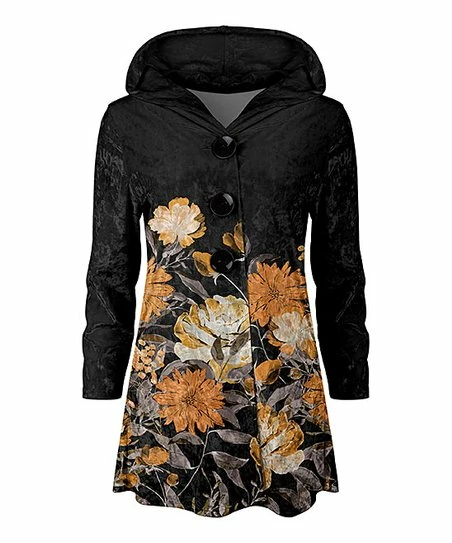 Enjoy the silky feel of soft velvet when you wrap up in this lovely button-front hoodie featuring a generous hood and a flowy hemline.