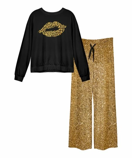 - Includes one black and gold leopard lips long-sleeve top and leopard lounge pants (two pieces total)
