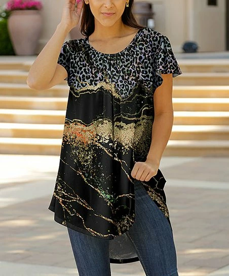 With its scoop neck, long length, and pleated silhouette, this slightly stretchy ruffle-sleeve tunic can be worn during the day or for a night out.