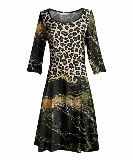 Lily | Black & Gold Leopard Marbled Three-Quarter Sleeve A-Line Dress – Women