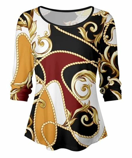 Elevate your any-day ensembles with the help of this elegant tunic that flaunts an eye-catching pattern finished with a flattering scoop neck design.