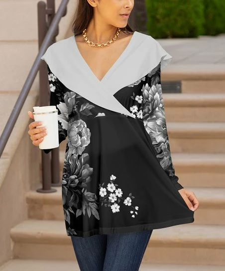 Look graceful in this flowy tunic featuring a flattering surplice bodice and a bold oversize collar.