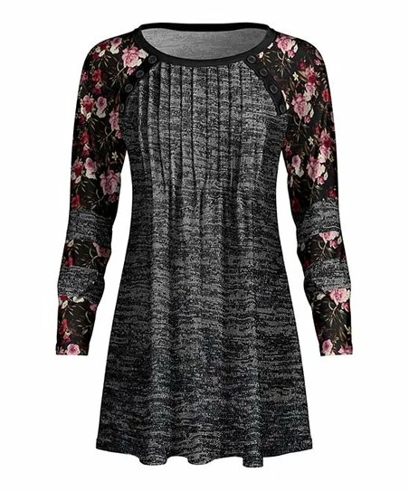 A contrasting raglan sleeve design lends fun flair to this pleated tunic charmed with accent buttons and a vibrant print for noteworthy appeal.