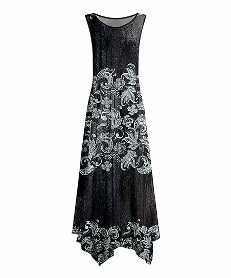 Lily | Black & Gray Foliage Sleeveless Handkerchief Maxi Dress – Plus
