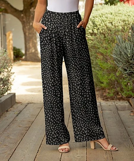 Stretch-infused fabric and a wide-leg silhouette bring casual comfort to these patterned pants featuring roomy pockets.