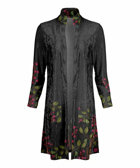 Layer on luxurious textural appeal with this flowy open cardigan made of sumptuous velvet. An artsy pattern adds interest to everything from dresses to jeans.