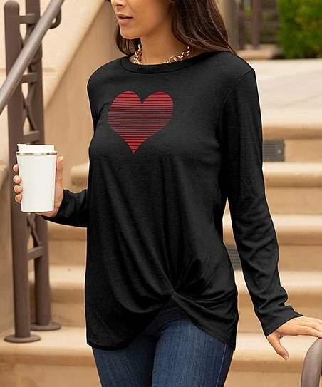 Elevate your casual closet in this sleek long-sleeve tunic featuring a dark all-over hue and center heart graphic with a twist-hem detail.