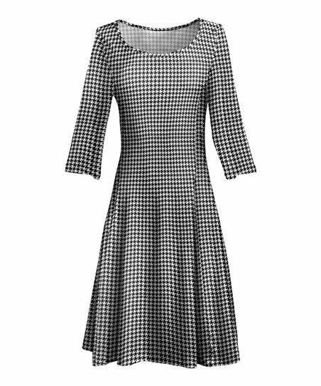 This dress features three-quarter sleeves and a boatneck cut.