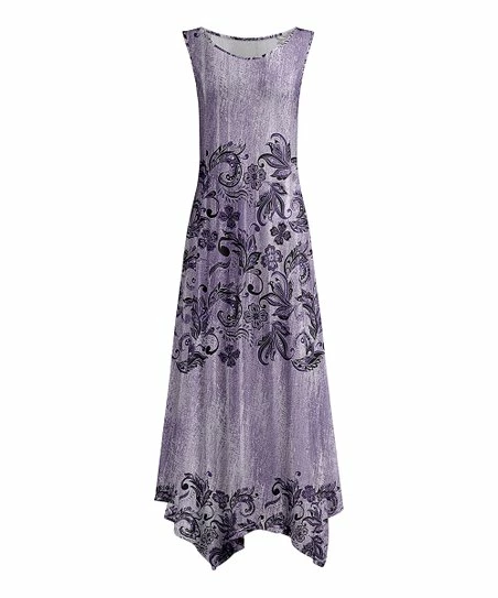 Flowy sleeveless dress featuring a maxi-length silhouette with handkerchief hem and floral paisley pattern.