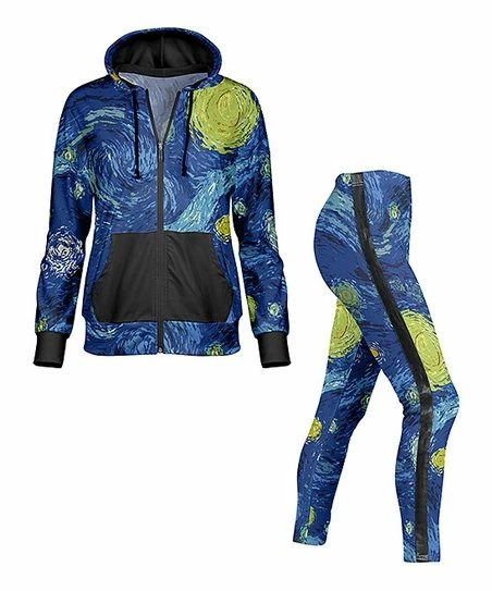 - Includes black and navy starry night zip-up hoodie and black and navy starry night side-stripe leggings (two pieces total)