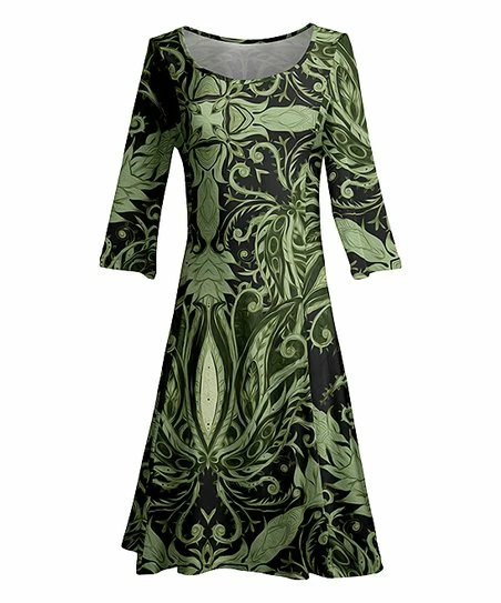 Create a polished look with this bright dress enlivened with a complementary fit-and-flare cut and spirited print. Three-quarter sleeves let you wear it from season to season with ease.