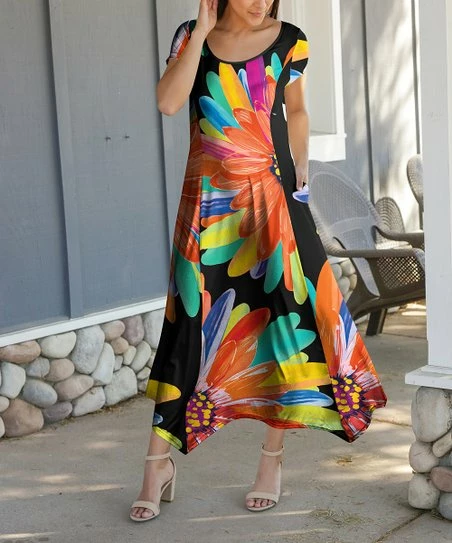 Lily | Black & Orange Rainbow Floral Handkerchief Maxi Dress – Plus
