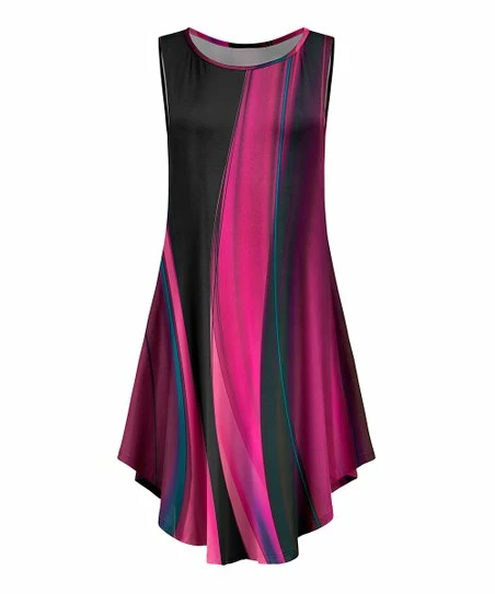 Add bold style to your dress wardrobe by slipping into this sleeveless dress featuring an A-line shape that floats away from the body and an elegant curved hemline.