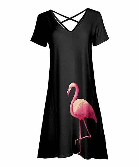 Dress up your wardrobe via this short-sleeved A-line that features a v-neck with crossed straps at the back. A whimsical print accent enlivens the skirt.