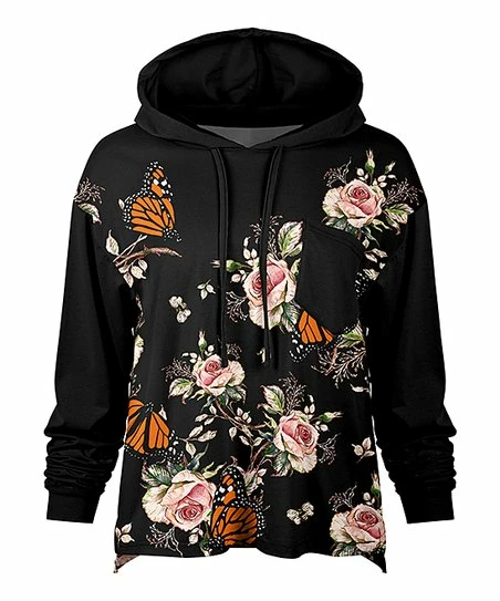 Speak to your inner romantic the comfy way by pulling on this slouchy hoodie in a floral print with butterflies. A patch pocket provides handy storage space for small odds and ends.