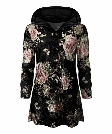 Cozy up in luxury when you pull on this velvet hooded tunic fashioned with a lengthy silhouette, half-button placket and a floral print.