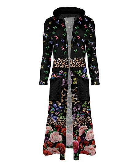 Greet chilly days in flamboyant fashion wearing this boldly patterned duster that provides extra coverage with an attached hood. Patch pockets meet your needs for storage and on-the-go hand-warming.