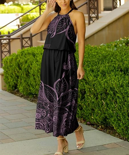 This halter maxi dress is made with stretch-infused material and a blouson top.