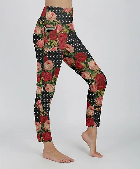 With its side slip pocket, this pair of leggings keeps phones or wallets within reach. An all-over abstract pattern of polka dots and roses adds chic style to the look.