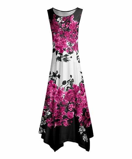 This stretch-enhanced sleeveless dress boasts a lush floral print and a flowing handkerchief hem for a sunny style with springtime flair.