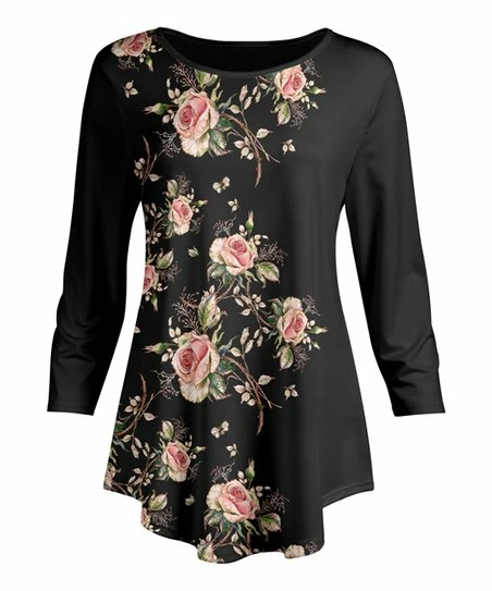 Chic three-quarter sleeve tunic features a boat neckline and flattering, flowy swing design.